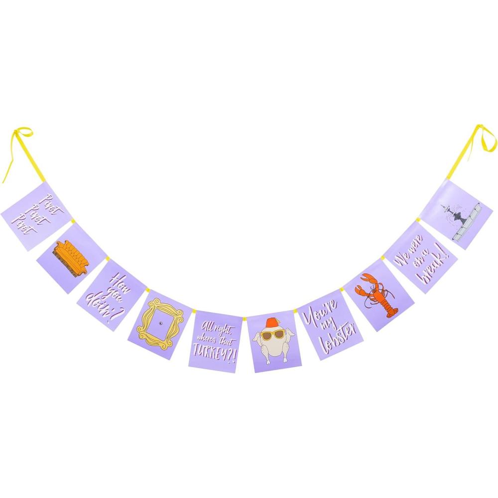 Surprise all your friends with this Silver Buffalo Friends How You Doin Icons 10-Pack Flag Party Banner. This Friends 10-Pack Flag Banner features classic Friends logos and quotes on a purple background. This party banner is used for all kinds of parties and now you can enjoy your party with Rachel, Monica, Joey, Phoebe, Chandler, and Ross with this 10-pack party banner. The material of the Party banner is eco-friendly. There is no terrible smell, perfect for party decorations. Just open the package to hang it directly because they have been attached together, which can really save your time and energy. Have confidence knowing you are purchasing officially licensed Friends products from Silver Buffalo. This 10-pack party banner measures each length 5-inches, width 0.5-inches, and height 6-inches. Silver Buffalo is a trendsetting housewares and home decor company based in the heart of New York City. Working in collaboration with licensors and brands, Silver Buffalo develops unique, creative, and ground-breaking products with a devotion to detail and commitment to innovation while staying true to current trends. Silver Buffalo has a proud tradition of manufacturing and distributing exciting products that connect with the child and fan(atic) in all of us. #TAGS: Friends, Central Perk, TV, Show, Dinner, Lunch, Breakfast, Kitchen, Central Perk decor, Home Decor, Central Perk, Christmas, Housewarming, Birthday, Party, Celebration, Finish Line Fence, Flags, Banner, Party Decor, Wall Decor, Party Decorations, Novelty, Pennant, Flag Decorations, Party Theme, Merchandise, Celebrate