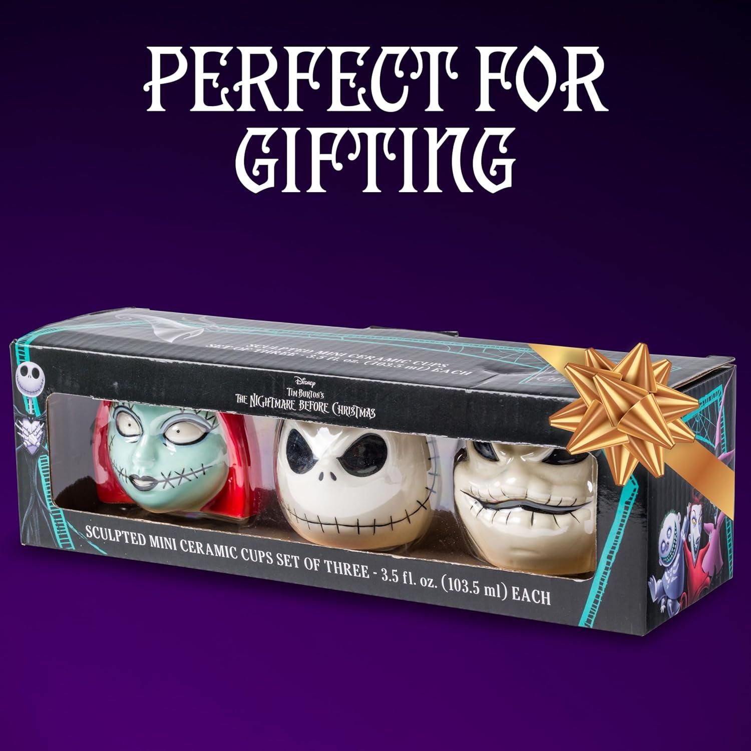 OFFICIAL MERCH: This Nightmare Before Christmas 3-piece mini cup set is official merchandise, a delightful gift or collectible for fans of Sally, Oogie Boogie, and the spooky world of Tim Burton’s holiday classic.