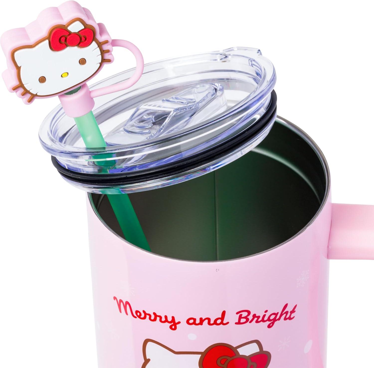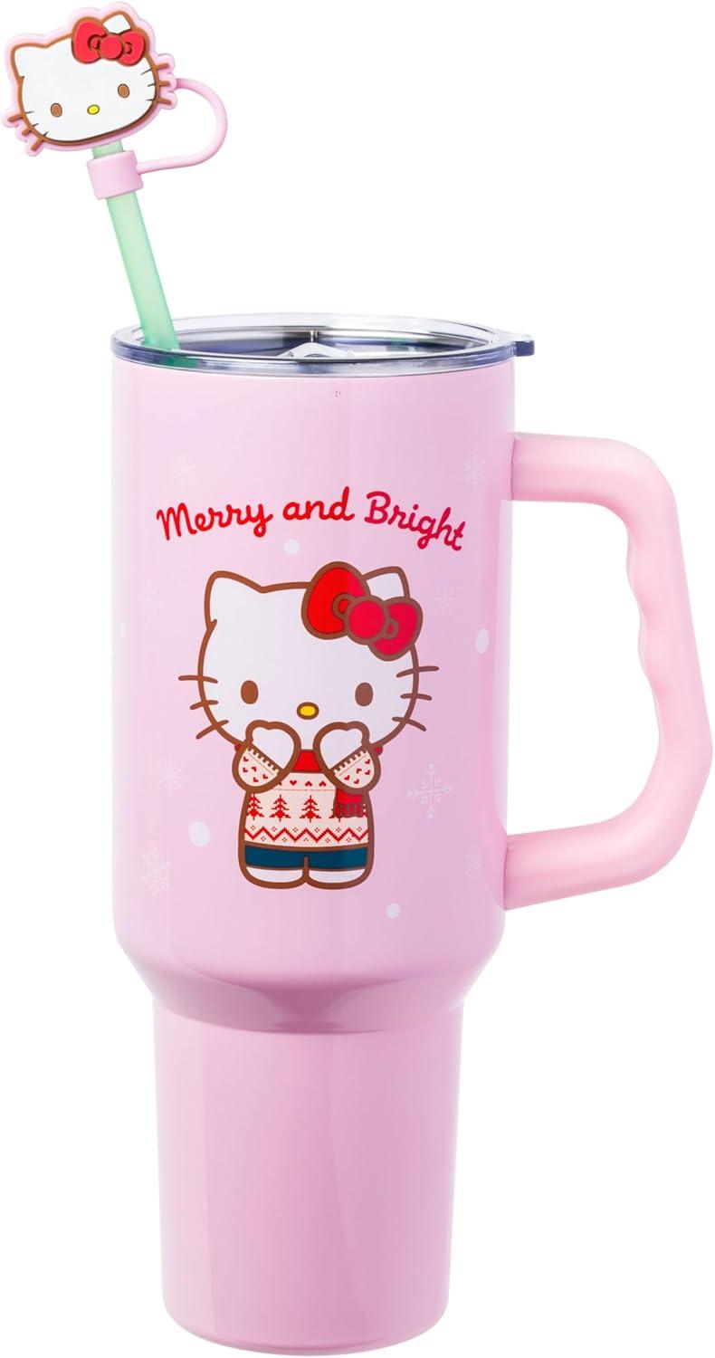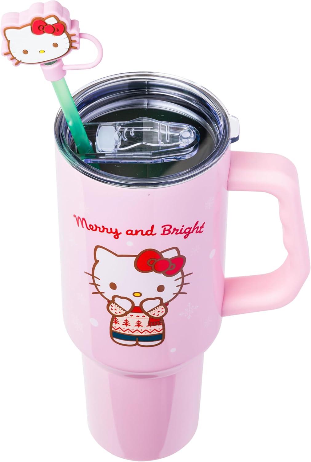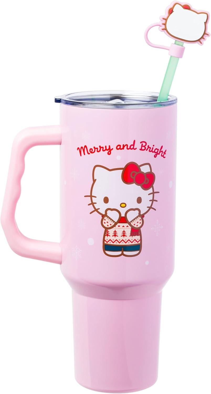 Silver Buffalo Sanrio Hello Kitty Christmas Holiday Sweater Merry and Bright Stainless Steel Tumbler with Handle, Straw, and Straw Cap, Fits in Standard Cup Holder, 40 Ounces